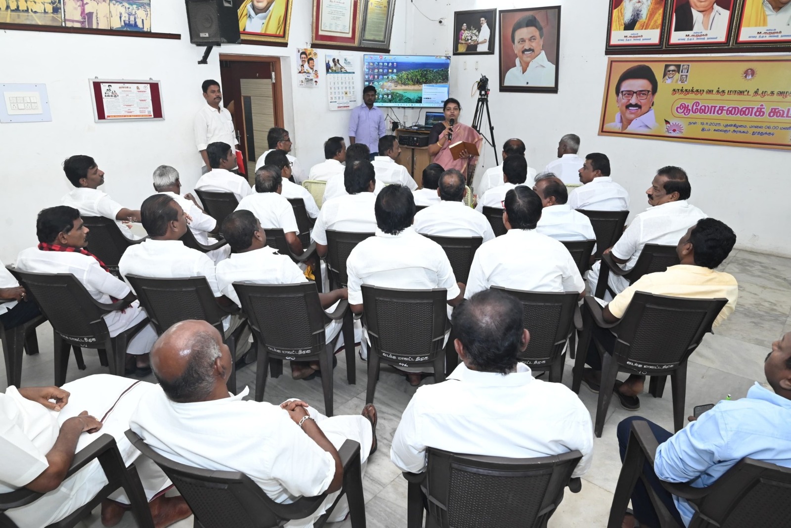 தூத்துக்குடி முதலமைச்சர் முக ஸ்டாலின் தலைமையில் காணொளி காட்சி வாயிலாக நடைபெற்ற “என் வாக்குச்சாவடி வெற்றி வாக்குச்சாவடி” எனும் தலைப்பிலான ஆலோசனைக் கூட்டம் தமிழகம் முழுவதும் நடைபெற்றது. அதனடிப்படையில் எட்டையாபுரம் சாலையில் உள்ள வடக்கு மாவட்ட திமுக அலுவலகமான கலைஞர் அரங்கில் வடக்கு மாவட்ட திமுக செயலாளரும் சமூகநலன் மற்றும் மகளிா் உாிமைத்துறை அமைச்சா் கீதாஜீவன் தலைமையில் நடைபெற்றது. கானொளி காட்சி மூலம் திமுக தலைவரும் தமிழக முதலமைச்சருமான முக.ஸ்டாலின் வடக்கு மாவட்டத்தில் உள்ள 3 தொகுதிகளில் நடைபெற்ற எஸ்ஐ ஆர் பணி கட்சி வளர்ச்சி பணி குறித்து ேகட்டறிந்ததை மட்டுமின்றி வரைவு வாக்காளா் பட்டியல் வௌியிட்ட பின்பு அதை ஆய்வு செய்து விடுபட்டிருந்த வாக்காளா்களையும் முழுமையாக இணைத்த பின்பு தான் நாம் முழுமையாக முழுகிணறையும் தாண்டியதாக அர்த்தம் அப்போது தான் நமக்கான முழு வெற்றியை பெறுவதற்கு களப்பணி ஆற்றியுள்ளோம் என்பதற்கான அர்த்தம் என்று தொிவித்துள்ளாா்.