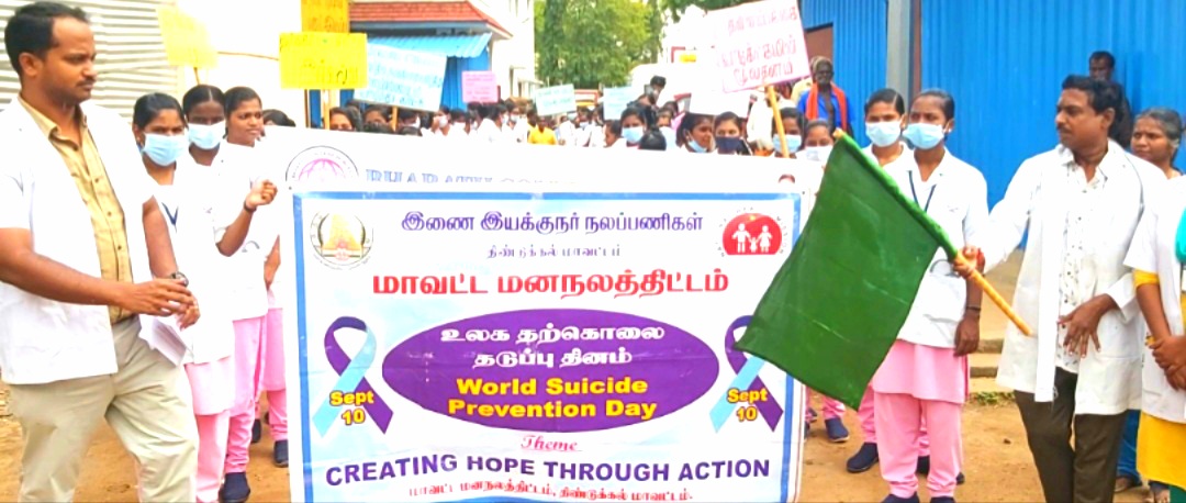 திண்டுக்கல் மாவட்டம் பழனி அரசு மருத்துவமனை வளாகத்தில் மருத்துவம் மற்றும் ஊரக நலப்பணிகள் துறை உத்தரவின் பேரில் மாவட்ட மனநல திட்டம் மற்றும் பழனி அரசு மருத்துவமனை இணைந்து தற்கொலைகளுக்கு எதிரான விழிப்புணர்வு பேரணி நடைபெற்றன.