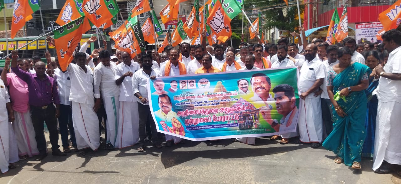 திருவாரூர் மாவட்ட பாஜக சார்பில் முற்றுகை போராட்டம் சனாதானத்தை ஒழிக்க வேண்டும் என்று முழங்கிய அமைச்சர் உதயநிதியையும் அதில் கலந்து கொண்ட இந்து சமய அறநிலையத்துறை அமைச்சர் சேகர்பாபுவையும் பதவி விலகக் கோரி திருவாரூர் மாவட்ட பாஜக சார்பில் மாவட்ட தலைவர் எஸ் பாஸ்கர் தலைமையில் மயிலாடுதுறை சாலை திருவாரூர் நகருக்கு உட்பட்ட புதுத்தெருவில் அமைந்துள்ள இந்துசமய அறநிலையத்துறை உதவி ஆணையர் அலுவலகத்தை முற்றுகையிட சென்ற பாஜகவினர் 200க்கும் மேற்பட்டோரை போலீசார் கைது செய்து தனியார் திருமண அரங்கில் தங்க வைக்கப்பட்டனர் முற்றுகைப் போராட்டத்தில்