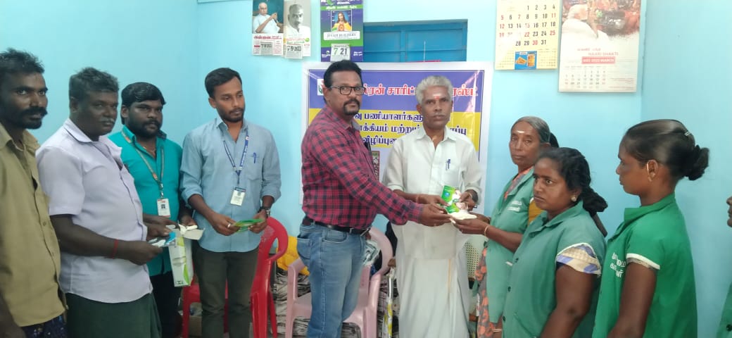 அதனையெடுத்து சில்ரன் சாரிடபிள் டிரஸ்ட் சார்பில் பாதுகாப்பு உபகரண பொருட்கள் துப்பரவு பணியாளர்களுக்கு வழங்கப்பட்டது கிராம சுகாதார செவிலியர் ஜேனட், வாழ்த்து வழங்கினார்