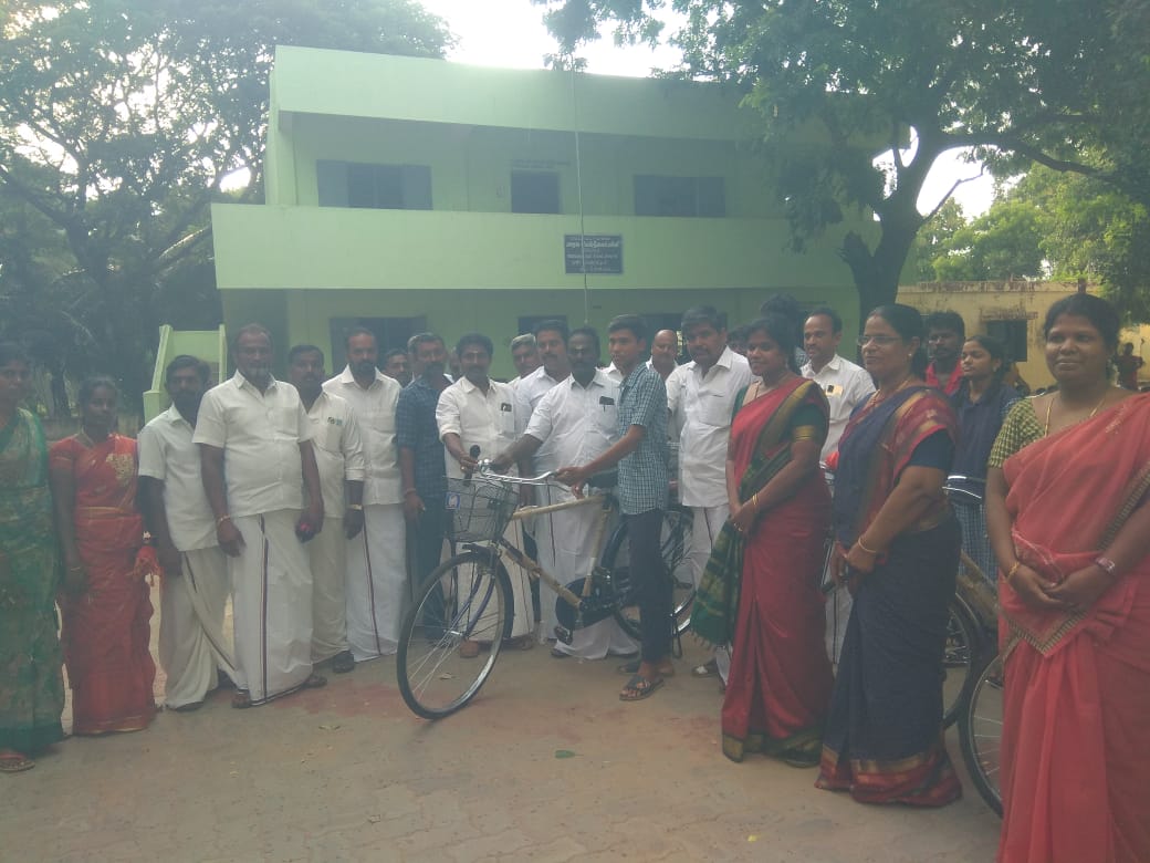 இதைதொடர்ந்து ஊராட்சி மன்ற தலைவர் பழனிவேல் பனிரெண்டாம் வகுப்பு படிக்கும் 73. மாணவ. மாணவிகளுக்கு.இலவச மிதிவண்டிகளை வழங்கினார்.
