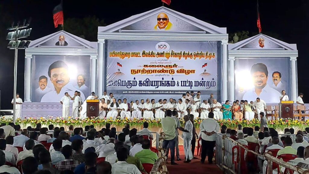 மயிலாடுதுறை மாவட்டம் சீர்காழி அருகே பூம்புகாரில் கலைஞரின் நூற்றாண்டு விழாவை முன்னிட்டு திமுக கலை இலக்கிய அணி சார்பாக கருத்தரங்கம் மற்றும் பட்டிமன்றம் நடைபெற்றது.
