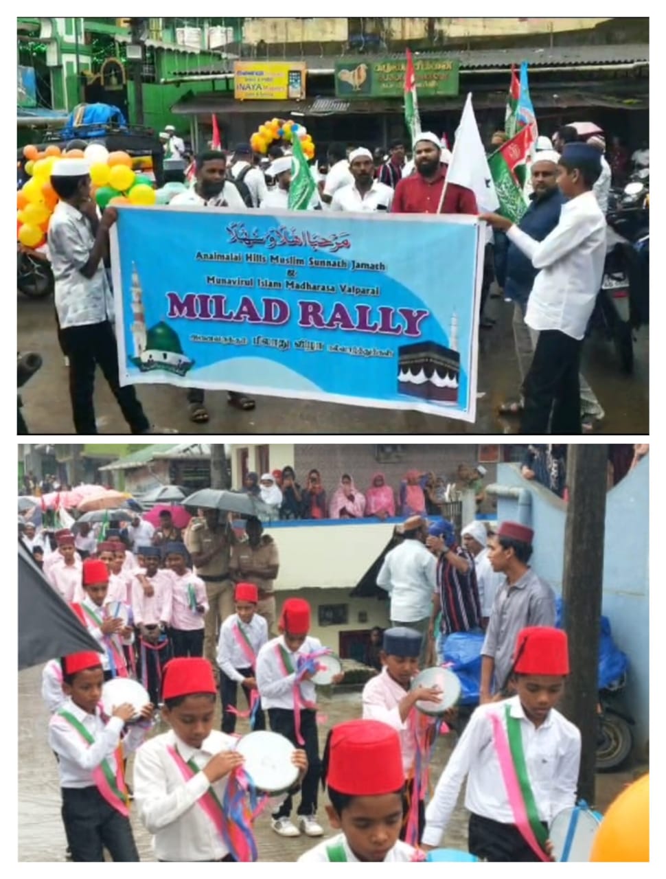 அதைத்தொடர்ந்து மதராஸ் மாணவர்கள் மற்றும் அனைவரும் நபிகள் நாயகத்தின் பாடல்களைப் பாடி நகர்பகுதிகளில் ஆடல் பாடலுடன் ஊர்வலமாகச்சென்றனர் பின்பு அனைவருக்கும் அன்னதானம் வழங்கப்பட்டது இவ்விழாவில் திரளான இஸ்லாமிய சகோதர, சகோதரிகள் கலந்து கொண்டு சிறப்பித்தனர்