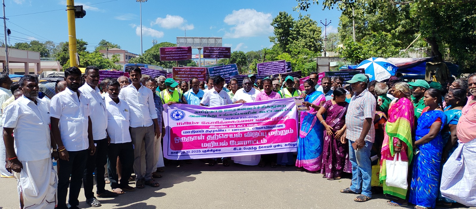 என்பன உள்ளிட்ட 16 அம்ச கோரிக்கைகளை நிறைவேற்ற தமிழக அரசை வலியுறுத்தி பல்வேறு கோஷங்களை எழுப்பினார் இதில் ஊராட்சி செயலாளர்கள் தூய்மை காவலர்கள் மக்கள் நல பணியாளர்கள் மேல்நிலை நீர் தேக்க தொட்டி இயக்குபவர்கள் கணினி உதவியாளர்கள் சுகாதார உறுப்பினர்கள் தூய்மை பணியாளர்கள் கிராம சுகாதார ஊக்குனர்கள் கலந்து கொண்டனர்