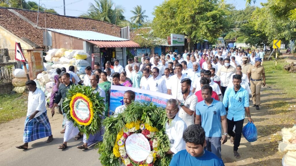 18ம் ஆண்டு சுனாமி தினத்தை முன்னீட்டுசீர்காழி அருகே திருமுல்லைவாசல் மீனவ கிராம மீனவர்கள் திருமுல்லைவாசல் பேருந்து நிலையம் அருகே உள்ள அரசு மேல்நிலைப் பள்ளியில் இருந்து நினைவுத் தூண் வரை சுமார் 1 கிலோ மீட்டர் தூரம் 500க்கும் மேற்பட்ட மீனவர்கள் சட்டமன்ற உறுப்பினர் பன்னீர்செல்வம் தலைமையில் ஊர்வலமாக சென்று திருமுல்லைவாசல் கடற்கரையோரம் அமைக்கப்பட்டுள்ள நினைவு தூனிர்க்கு மலர்வளயங்கள் வைத்து மலர்கள் தூவினர் அதைத்தொடர்ந்து நினைவுத் தூண் அருகில் இறந்தவர்கள் நினைவாக வைக்கப்பட்டிருந்த செங்கற்களுக்கு மலர்களைத் தூவினர் அங்கு மெழுகுவர்த்தி ஏற்றி அஞ்சலி செலுத்தினர்.இந்த ஊர்வலத்தில் 500-க்கும் மேற்பட்ட மீனவர்கள் பங்கேற்றனர் இதேபோல் பழையார், கூழையார், தொடுவாய், பூம்புகார் உள் ளிட்ட மீனவ கிராமங்களில் பேரலையால் இறந்தவர்களுக்கு 1000க்கும் மேற்பட்டோர் அஞ்சலி செலுத்தினர்.