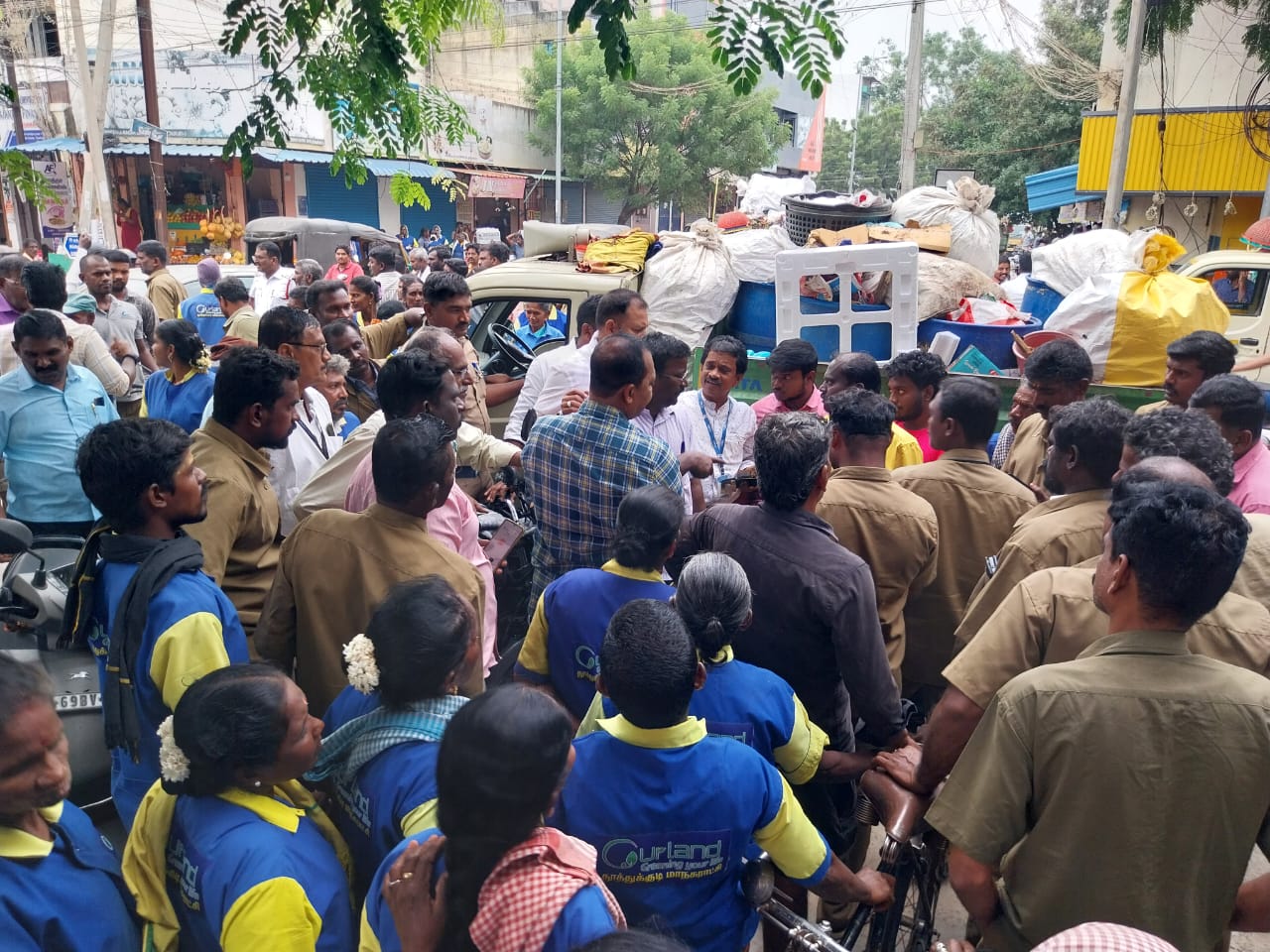 இந்த நிலையில் அவர்லாந்து நிறுவன மேலாளர் முருகேசன் தூய்மை பணியாளர் சங்க தலைவர் பொன்ராஜ் சஸ்பெண்ட் ஆர்டர் வழங்கும் குட்டி அணி வாகன ஓட்டக்கூடாது என்று உத்தரவிட்டுள்ளார் இதனை அடுத்து அந்தந்த தெருக்களில் குப்பை அள்ளிக் கொண்டு இருந்த தூய்மை பணியாளர்கள் குப்பையுடன் அவர் லேண்ட் அலுவலகம் உள்ள சிதம்பர நகருக்கு 50க்கும் மேற்பட்ட குப்பைகளுடன் குப்பை வண்டி நூற்றுக்கும் மேற்பட்ட தூய்மை பணியாளர்கள் போராட்டத்தில் ஈடுபட்டனர்