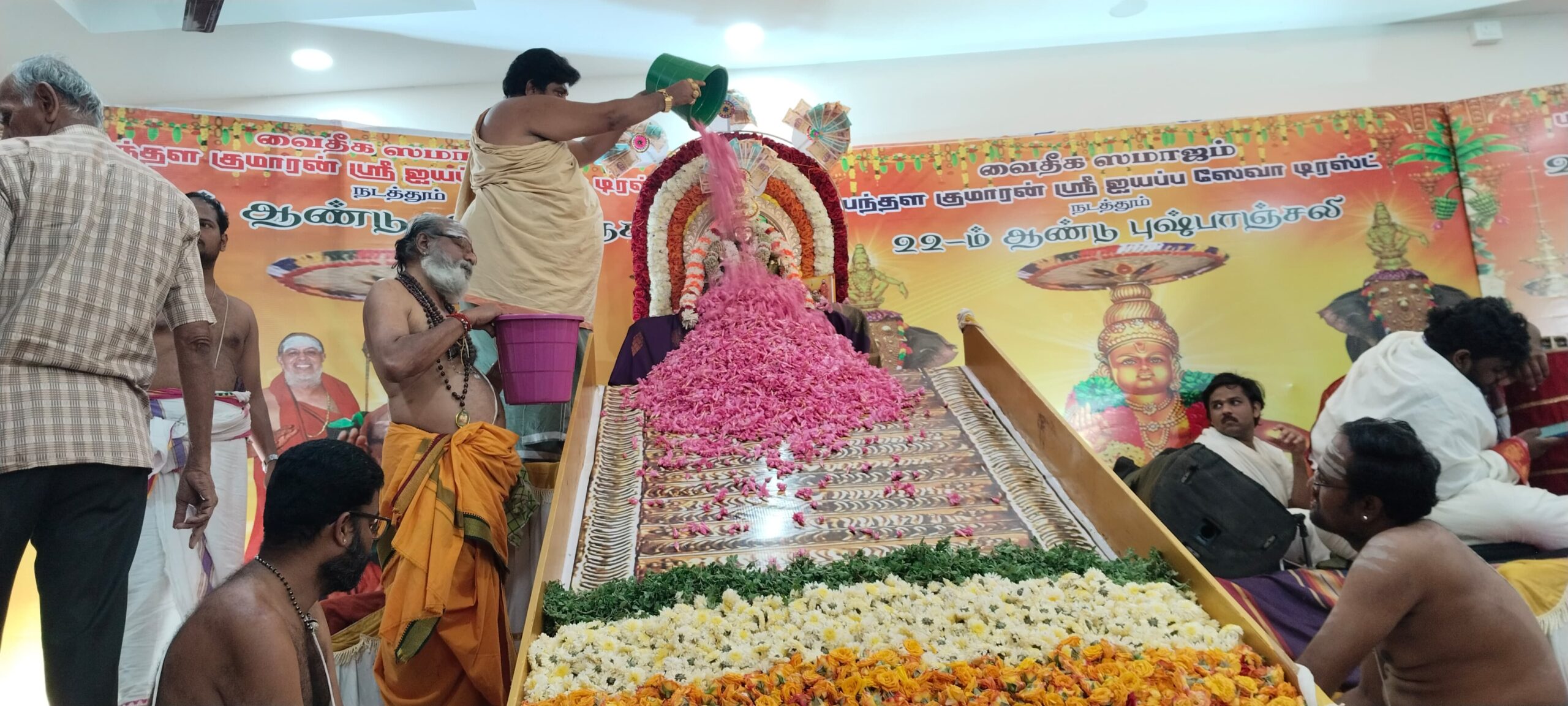 பந்தள குமாரன் ஸ்ரீ ஐயப்ப சேவா டிரஸ்ட் சார்பாக தொடர்ந்து 22 வது ஆண்டாக நடைபெற்ற புஷ்பாஞ்சலி நிகழ்ச்சியில் ரோஜா,மல்லி,தாமரை என சுமார் 2 டன் மலர்களால் ஐயப்ப சுவாமிக்கு சிறப்பு பூஜை செய்யப்பட்டது…