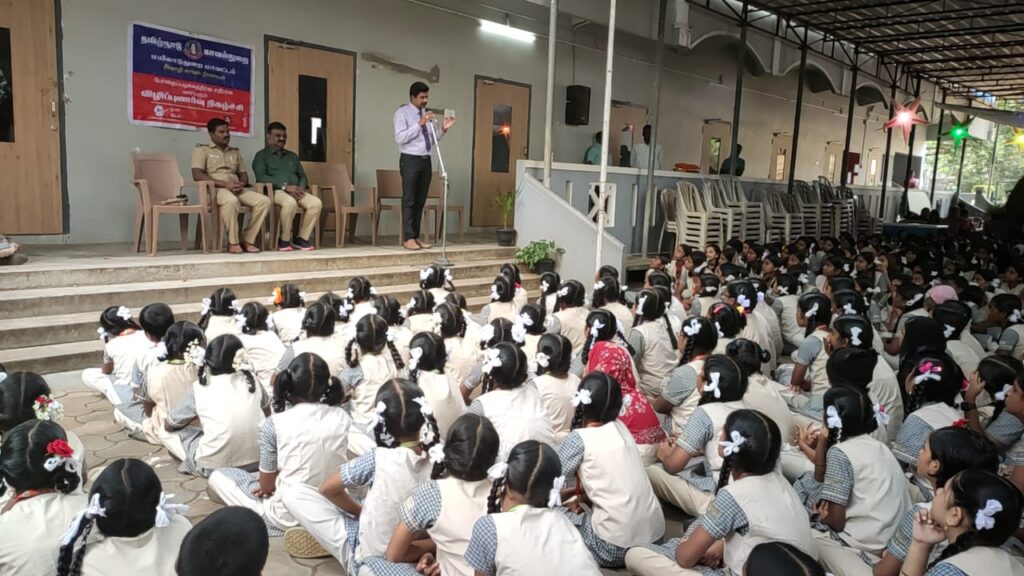 மயிலாடுதுறை மாவட்டம் சீர்காழி பகுதியில் உள்ள விவேகானந்தா பள்ளியில் காவல்துறை சார்பில் போதை இல்லா சமுதாயத்தை உருவாக்குவதற்கான விழிப்புணர்வு நிகழ்ச்சி நடைபெற்றது. இதில் பள்ளி மாணவிகளுக்கு போதைப் பழக்கத்தினால் ஏற்படும் தீமைகள் குறித்து விளக்கம் அளிக்கப்பட்டு , போதை இல்லாத சமுதாயத்தை உருவாக்க மாணவர்களால் மட்டுமே முடியும். எனவே மாணவர்கள் இங்கு உறுதிமொழி எடுத்துக் கொண்டு தங்கள் வாழ்நாள் முழுவதும் பின்பற்றுவதோடு தங்கள் இல்லத்திலும் மற்றும் உறவினர்கள் நண்பர்களுக்கும் போதை படிக்கத்தின் தீமைகள் குறித்து எடுத்துரைத்து போதை பழக்கத்திலிருந்து அவர்களை மீட்டெடுக்க சிறு முயற்சி மேற்கொள்ள வேண்டும் .அவ்வாறு செய்தால் வருங்கால சமுதாயம் போதையில்லாத மற்றும் போதைப்பொருள் எதற்கும் அடிமை ஆகாத சமுதாயம் உருவாக்க முடியும் என சீர்காழி காவல் ஆய்வாளர் சிவக்குமார் பேசினார், தொடர்ந்து போதைப் பழக்கத்தினால் ஏற்படும் தீமைகள் குறித்தும் உடல் உறுப்புகள் பாதிக்கப்பட்டு உயிர் இழப்பு ஏற்படுவது குறித்தும் காவல் துறை சார்பில் விளக்கம் அளிக்கப்பட்டது .
