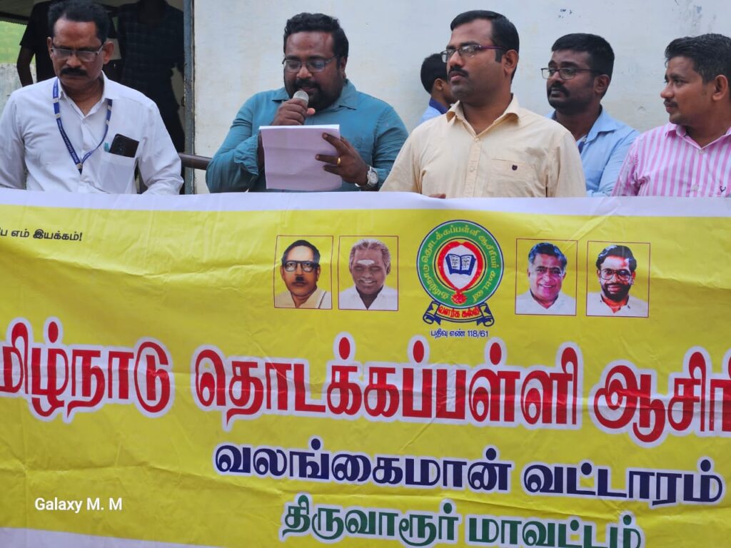 திருவாரூர் மாவட்டம் வலங்கைமான் வட்டார கல்வி அலுவலர் அலுவலகம் முன்பு, தமிழ்நாடு தொடக்கப்பள்ளி ஆசிரியர் கூட்டணி சார்பில் ஆர்ப்பாட்டம் நடைபெற்றது.