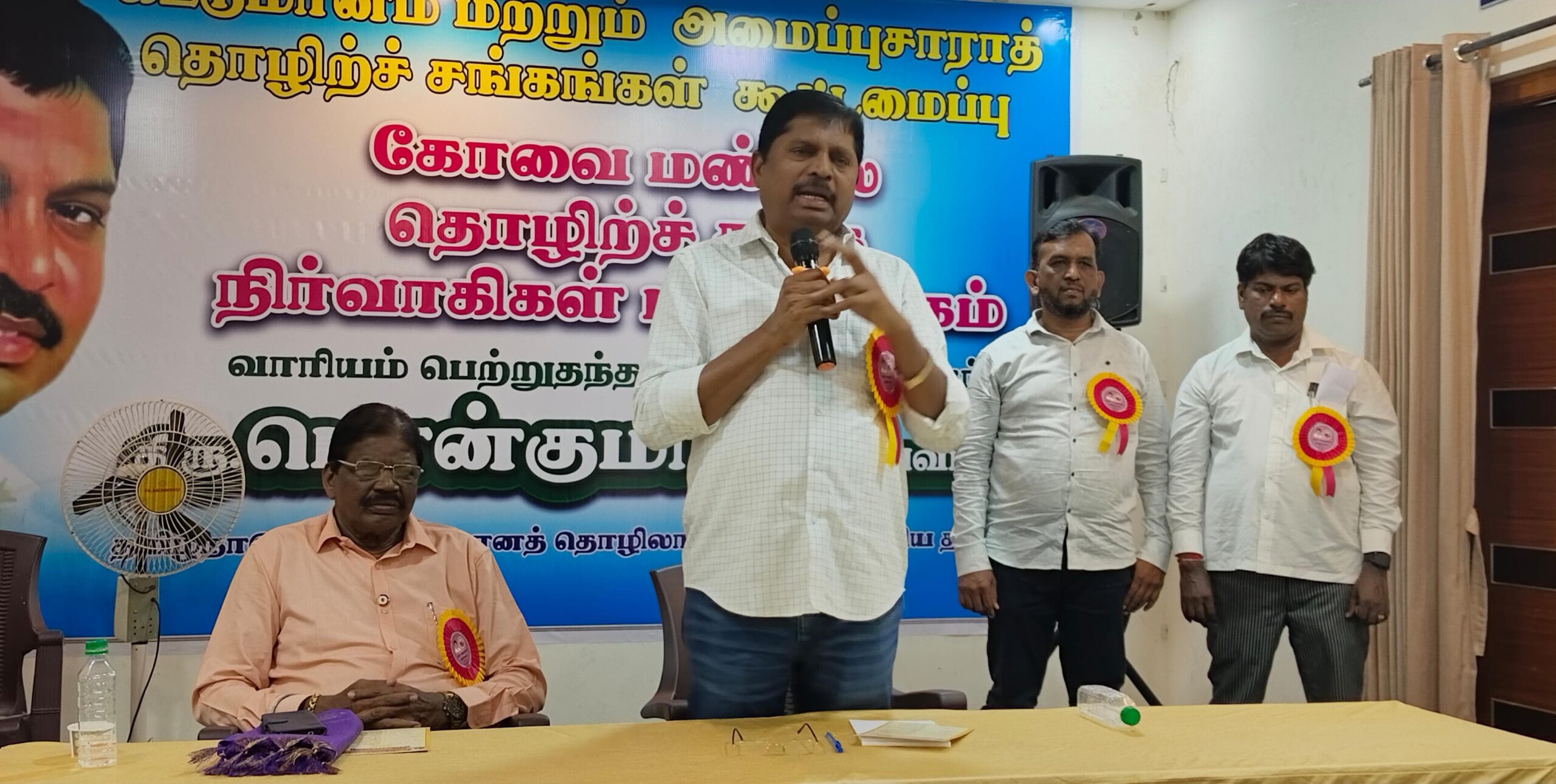 கட்டுமானம் மற்றும் அமைப்பு சாரா தொழிலாளர்கள் கூட்டமைப்பின் கோவை மண்டலம் சார்பாக தொழிற்சங்க நிர்வாகிகளுக்கான பயிலரங்கம் கோவை சுங்கம் பைபாஸ் சாலையில் உள்ள ஆர்.ஜே.மகால் அரங்கில் நடைபெற்றது.