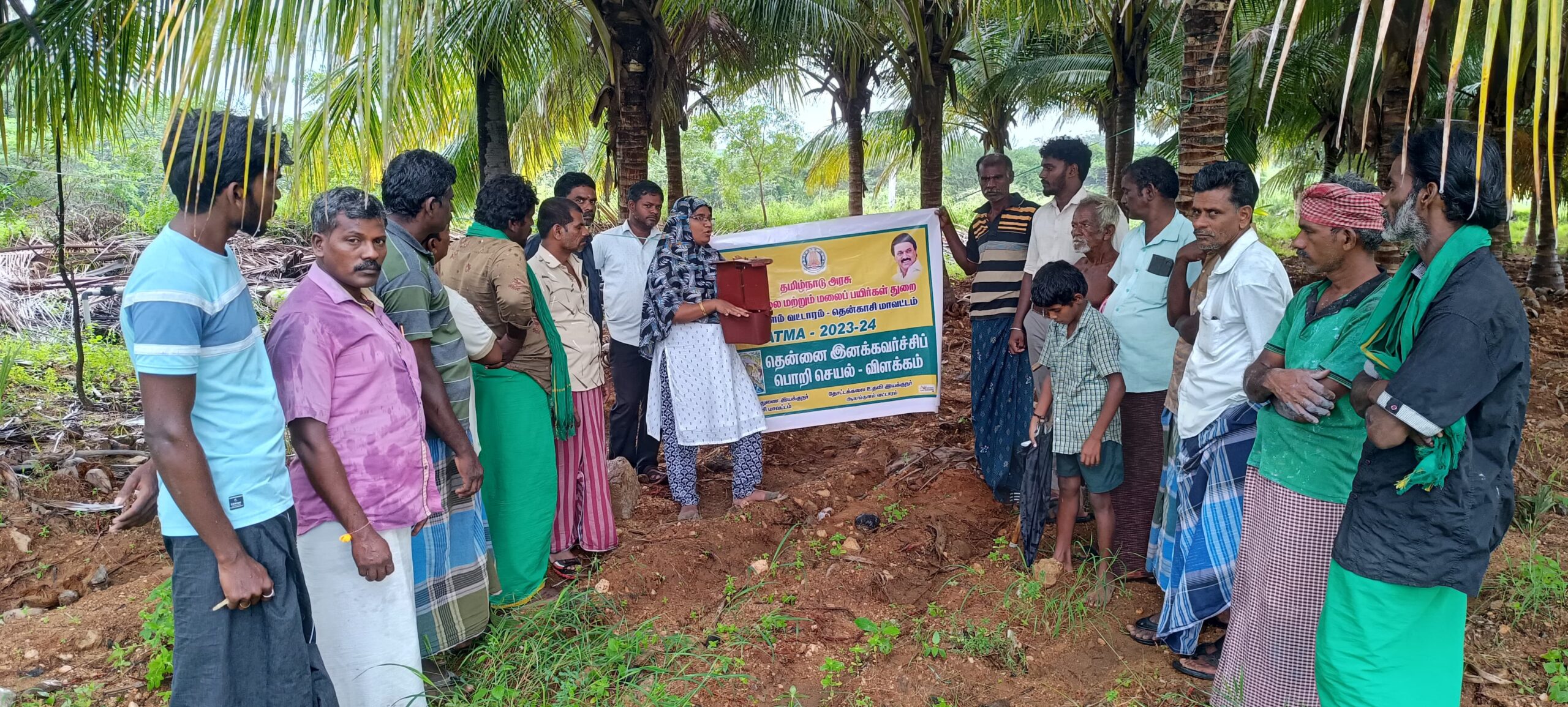இதில் தோட்டக்கலை அலுவலர் ஜீனத் பேகம் இந்தப் பருவ கால நிலையை பொறுத்தவரை தென்னையில் வேர் வாடல் நோய் சிவப்பு கூண் வண்டுகள் மற்றும் ரூகோஸ் சுருள் வெள்ளை ஈக்களின் தாக்குதல் அதிகமாக உள்ளது. இதனைக் கட்டுப்படுத்தும் வழிமுறைகள் பற்றி இப் பயிற்சியில்விவசாயிகளுக்கு எடுத்துரைத்தார்கள் வேளாண்மை தொழில்நுட்ப மேலாண்மை முகமை ஏ டி எம் ஏ திட்டத்தின் கீழ் சிவப்பு கூன் வண்டுகள் காண்டாமிருக வண்டுகளை கட்டுப்படுத்தும் இனக்கவர்ச்சி பொறி பற்றி செயல்முறை விளக்கம் செய்து காண்பிக்கப்பட்டது.. இதில் சுற்று வட்டார விவசாயிகள் கலந்து கொண்டு பயன்பெற்றனர்.