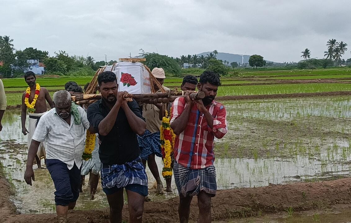 இறந்தவரின் உடலை விளை நிலங்களில் கொண்டும் செல்லும் உறவினர்கள்