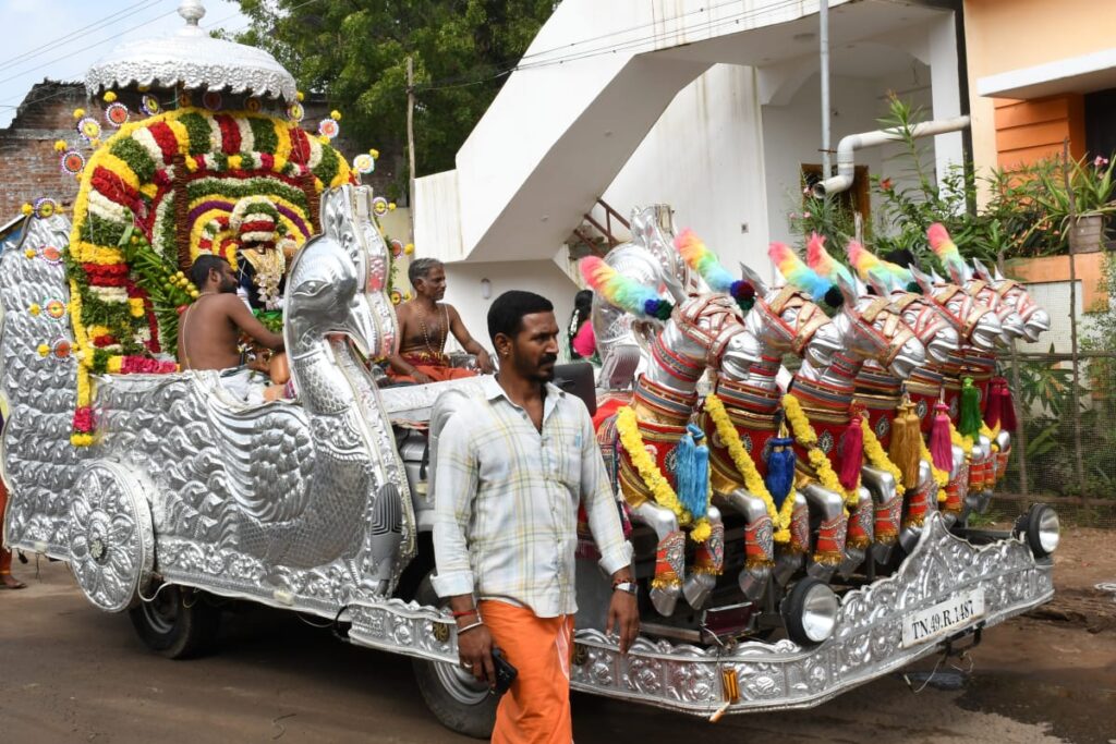 அதனைத் தொடர்ந்து வெள்ளி கவசம் சாற்றுதல் நடைபெற்றது. இன்று புதன்கிழமை காலை ஸ்ரீ ஆஞ்சநேயர் சுவாமி ஜெயந்தி விழாவை ஒட்டி சுவாமிமலை ஸ்ரீ ராமானுஜ கூட பஜனை குழுவினர், அய்யம்பேட்டை ஸ்ரீமத் வெங்கட்ரமணா பஜனை குழுவினர், அம்மாபேட்டை ஸ்ரீ டி ஆர் நாராயணசாமி பாகவதர் குழுவினர்,கும்பகோணம் ஸ்ரீ ஜெயலட்சுமி விலாச பஜனை சபா குழுவினர் மற்றும் தமிழகத்தின் சிறப்புமிக்க தவில், நாதஸ்வர கலைஞர்கள் குழுவினருடன் சாரட் வாகனத்தில் ஸ்ரீ ஆஞ்சநேயர் சுவாமி வீதி உலா காட்சி நடைபெற்றது,