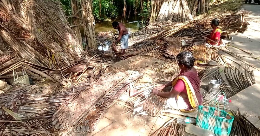 தஞ்சாவூர் மாவட்டம், பாபநாசம் தாலுக்கா திருக்கருக்காவூர் மற்றும் ஒன்பத்துவேலி உள்ளிட்ட பகுதிகளில் தென்னை மட்டையை கொண்டு கீற்று பின்னும் தொழிலில் கூலி தொழிலாளர்கள் ஈடுபட்டு வருகின்றனர்.