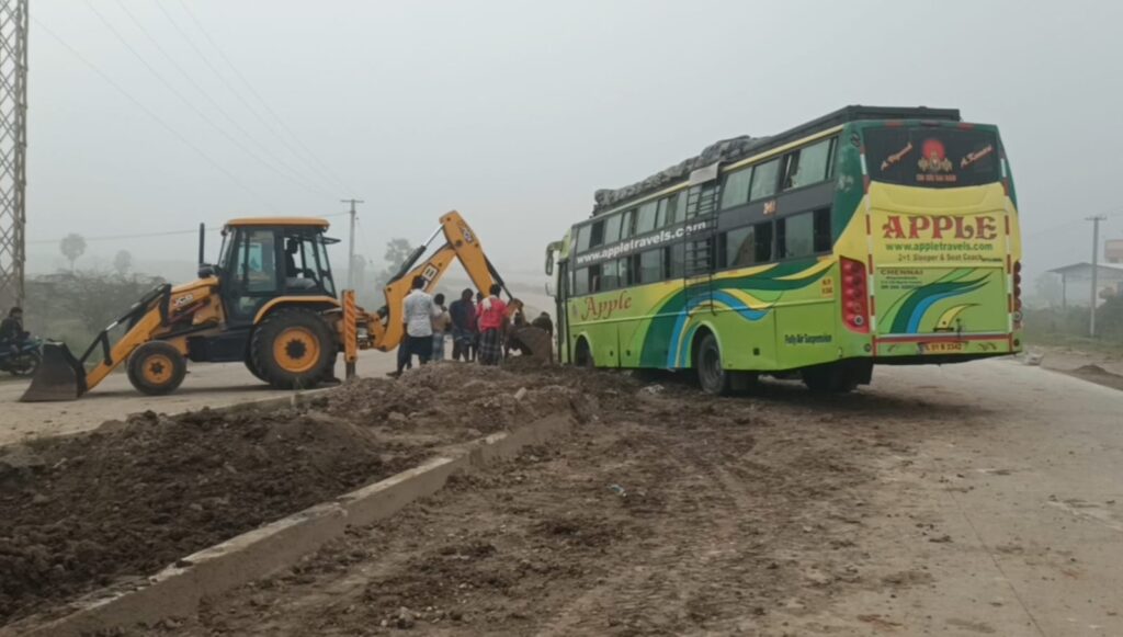 இந்நிலையில் சென்னையிலிருந்து புதுக்கோட்டை செல்லும் தனியார் சொகுசு பேருந்து சீர்காழி புறவழிச் சாலையில் அதிவேகமாக வந்துள்ளது. சாலையில் பணிகள் நடைபெற்று வருவதால் மறுபுறம் செல்வதற்கான அறிவிப்பு பலகை இருப்பது தெரியாமல் பணியின் காரணமாக தடுப்பு கட்டைக்கு உள்ளே பேருந்து புகுந்துள்ளது.