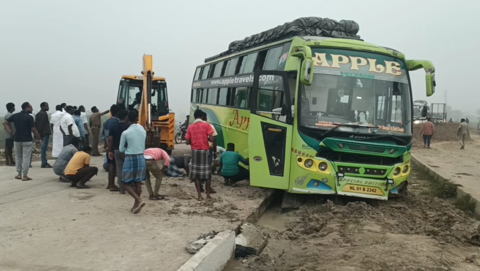 இதனால் கட்டுப்பாட்டை இழந்த பேருந்து சாலையின் குறுக்கே சேற்றில் புதைந்து நின்றது சேற்றில் சிக்கியதால் வேகம் குறைந்து பெரும் விபத்து தவிர்க்கப்பட்ட நிலையில் பேருந்தில் பயணித்த 40க்கும் மேற்பட்ட பயணிகள் அதிர்ஷ்டவசமாக உயிர்த்தபினர். தகவல் அறிந்து வந்த சீர்காழி போலீசார் விபத்தில் சிக்கிய பேருந்தை மீட்கும் பணியை ஈடுபட்டனர்.