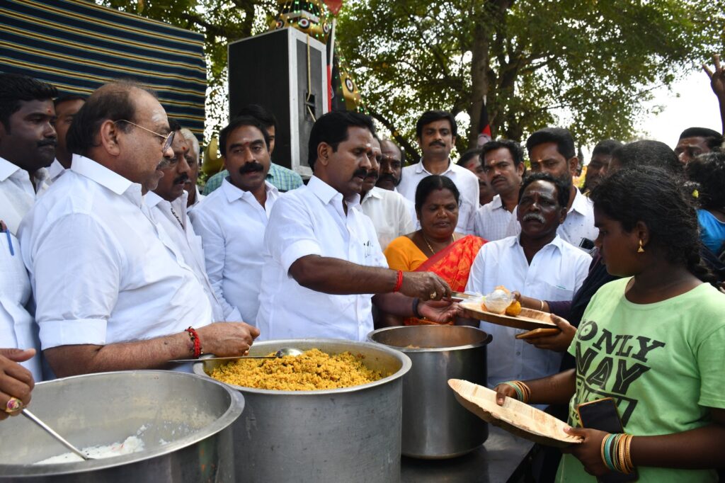 அதனைத் தொடர்ந்து திருவாரூர் நகருக்கு உட்பட்ட இரண்டாவது வார்டு கழகம் ஏற்பாட்டில் ஏழை எளியோருக்கு அன்னதானம் வழங்கினார். நிகழ்ச்சியில் கழக அமைப்பு செயலாளரும் திருவாரூர் மாவட்ட கழக செயலாளருமான முன்னாள் அமைச்சர் இரா.காமராஜ் எம்எல்ஏ பேசியதாவது, தமிழக மக்களுக்கு உண்மையான தொண்டு செய்ய வேண்டும் இன்று நோக்கத்தோடு புரட்சித் தலைவர் அனைத்திந்திய அண்ணா திராவிட முன்னேற்றக் கழகத்தை உருவாக்கினார் மக்களோடு மக்களாக பணியாற்றி அன்பை பகிர்ந்து கொண்டவர்