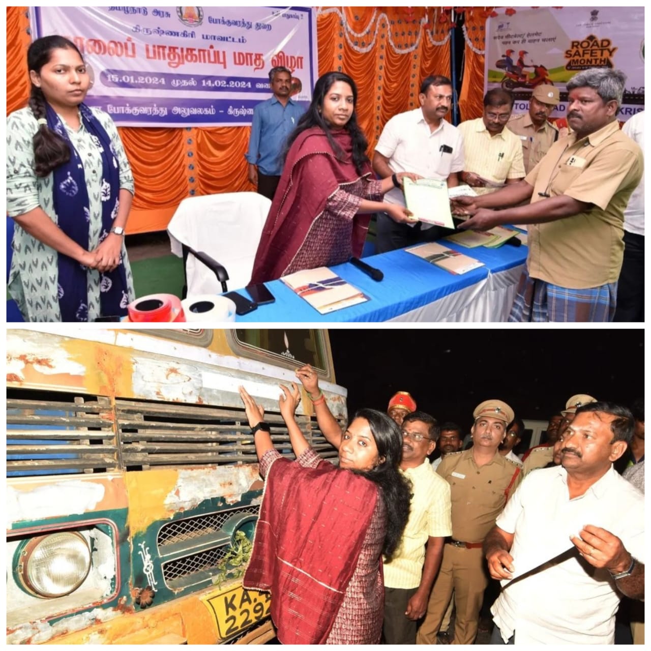 கிருஷ்ணகிரி சுங்கசாவடி, அருகே வட்டார போக்குவரத்துறை சார்பாக சாலை பாதுகாப்பு மாத விழாவை மாவட்ட ஆட்சித்தலைவர் கே.எம்.சரயு துவக்கி வைத்து, வாகன ஓட்டுநர்களுக்கு விழிப்புணர்வு துண்டு பிரசுரங்களை வழங்கி, வாகனங்களில் ஒளிரும் வில்லைகளை ஒட்டினார். உடன் துணை ஆட்சியர் (பயிற்சி) தாட்சியாயிணி, வட்டார போக்குவரத்து அலுவலர்கள் காளியப்பன் (கிருஷ்ணகிரி) கே.எஸ்.துரைசாமி (ஒசூர்) உள்ளிட்ட பலர் உள்ளனர்.