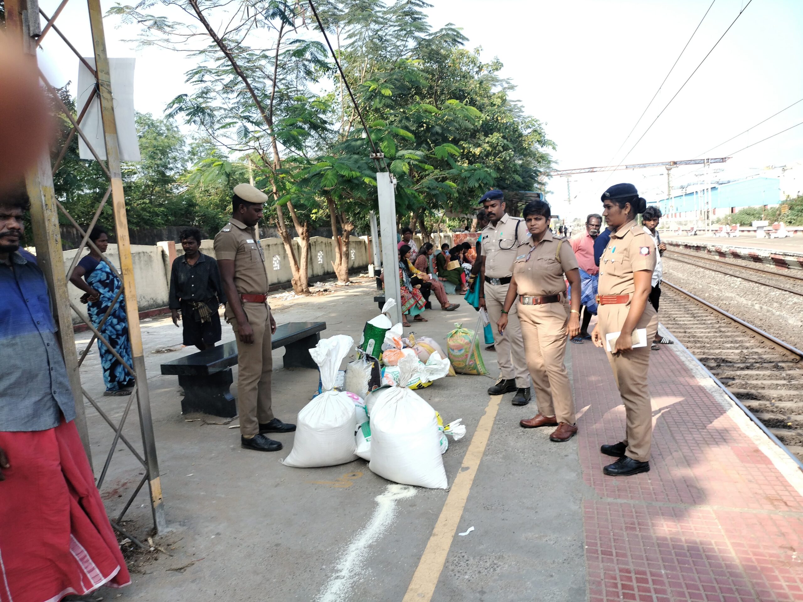 அப்பொழுது நடைமேடை பகுதியில் ரயில் பயணிகள் அமரும் இடத்தில் கீழே 25 மூட்டை அரிசி மூட்டைகள் அடுக்கி வைப்பது கண்டுபிடிக்கப்பட்டது