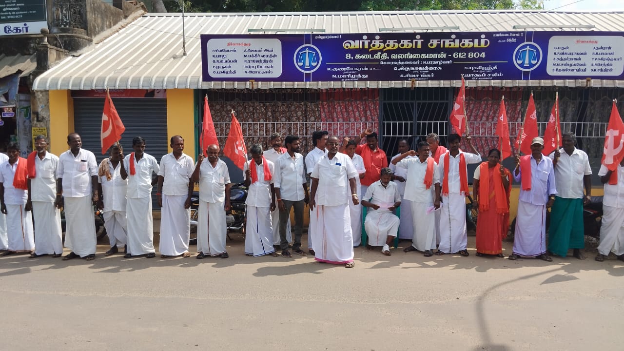 திருவாரூர் மாவட்டம் வலங்கைமான் கடைவீதியில் தமிழ் மாநில விவசாய தொழிலாளர் சங்கம் சார்பில் பெருந்திரள் கவன ஈர்ப்பு ஆர்ப்பாட்டம் நடைபெற்றது.