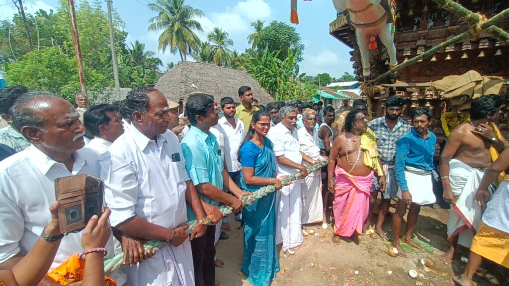 தொடர்ந்து திருவாரூர் மாவட்ட ஆட்சியர் சாருஸ்ரீ, திருவாரூர் சட்டமன்ற உறுப்பினர் பூண்டி கலைவாணன் ஆகியோர் தேரினை வடம்பிடித்து தேரோட்டத்தை துவக்கிவைத்தனர். இதனை தொடர்ந்து திருத்தேரினை பக்தர்கள் வடம் பிடித்து நான்கு ரத வீதிகளிலும் வலம் வந்தது.