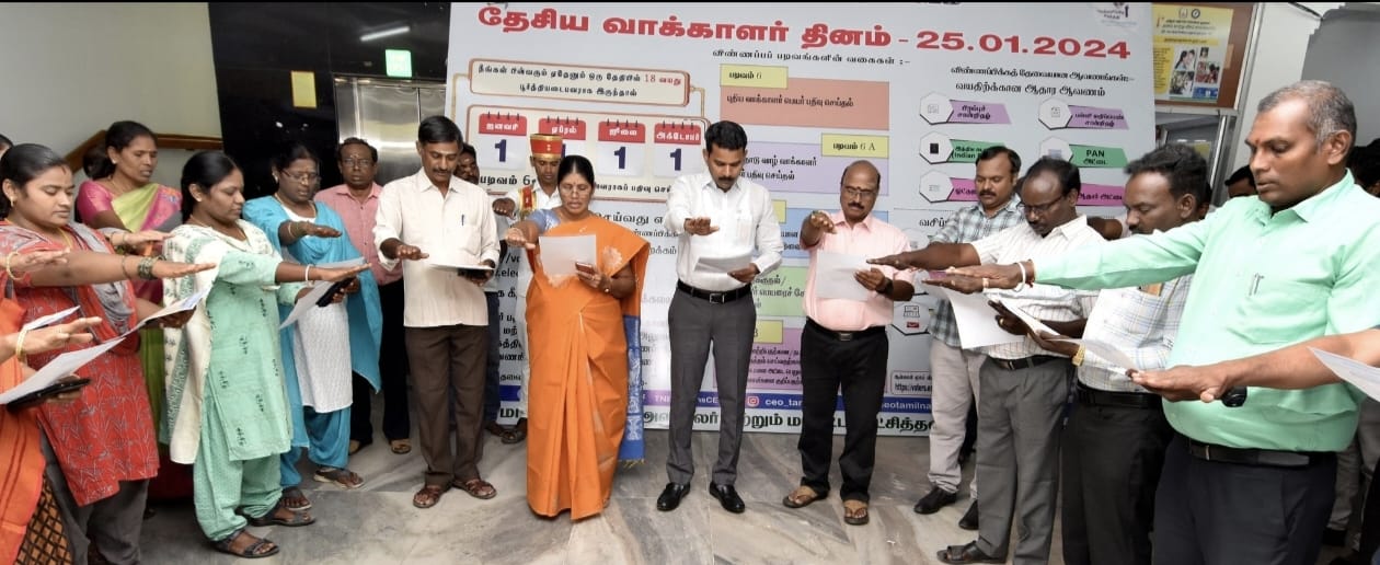 கிருஷ்ணகிரி மாவட்ட ஆட்சியர் அலுவலக வளாகத்தில், 14-வது தேசிய வாக்காளர் தினத்தையொட்டி, வாக்காளர் தின உறுதிமொழியை மாவட்ட வருவாய் அலுவலர் அ.சாதனைக்குறள் அவர்கள் தலைமையில் அனைத்து அரசு துறை அலுவலர்கள் எடுத்துக்கொண்டனர்.