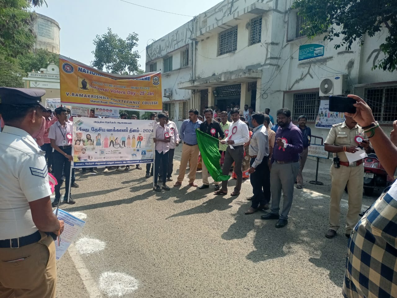 திருவோற்றியூர்,14 வது தேசிய வாக்காளர் தினத்தை முன்னிட்டு என் 10 திருவெற்றியூர் சட்டமன்ற தொகுதியில் வாக்காளர் பதிவு அலுவலர் திரு வே நவேந்திரன் அவர்கள் தலைமையில் ஸ்ரீ ராமகிருஷ்ணா தொழில்நுட்பக் கல்லூரி மாணவர்களை கொண்டு தேசிய வாக்காளர் தின விழிப்புணர்வு பேரணி திருவொற்றியூர் மண்டலம் அலுவலகத்தில் இருந்து துவக்கப்பட்டு திருவொற்றியூர் ரயில் நிலையம் வரை நடைபெற்றது