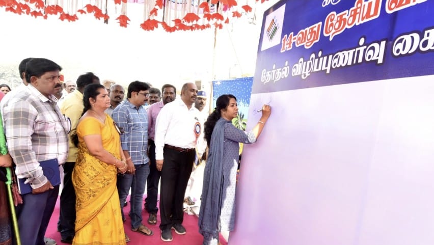 கிருஷ்ணகிரியில் உள்ள புதிய பேருந்து நிலையத்தில், 14-வது தேசிய வாக்காளர் தினத்தையொட்டி, வாக்காளர் விழிப்புணர்வு கையெழுத்து இயக்கத்தை மாவட்ட தேர்தல் அலுவலர் மற்றும் மாவட்ட ஆட்சித்தலைவர் கே.எம்.சரயு (25.01.2024) அன்று துவக்கி வைத்தார்.