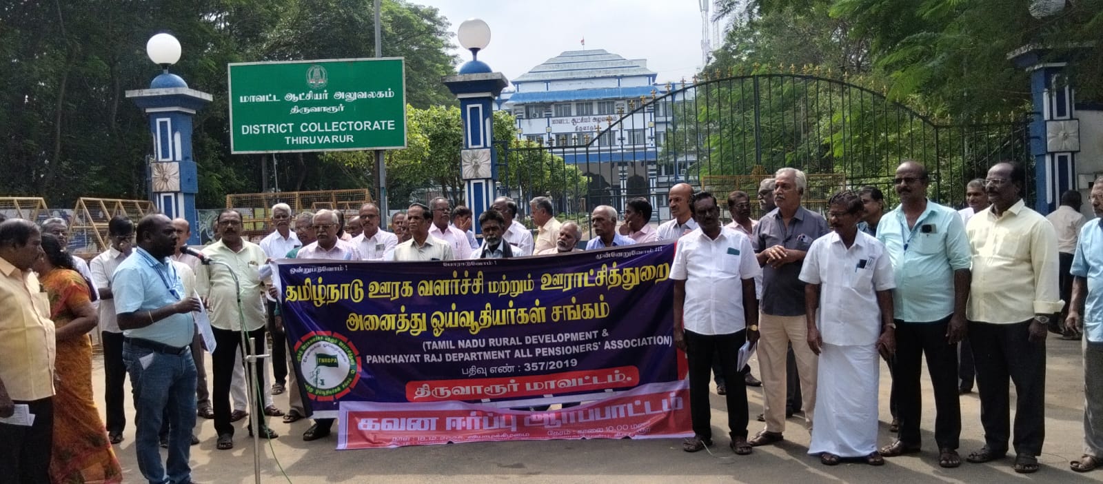 திருவாரூரில் தமிழ்நாடு ஊரக வளர்ச்சி மற்றும் ஊராட்சி துறை அனைத்து ஓய்வூதியர்கள் சங்க திருவாரூர் மாவட்ட சார்பில் கவன ஈர்ப்பு ஆர்ப்பாட்டம் மாவட்ட ஆட்சியர் அலுவலக முகப்பு வாயில் முன்பு நடைபெற்றது. மாவட்டத் தலைவர் தமிழ்ச்செல்வன் தலைமை வகித்தார்.