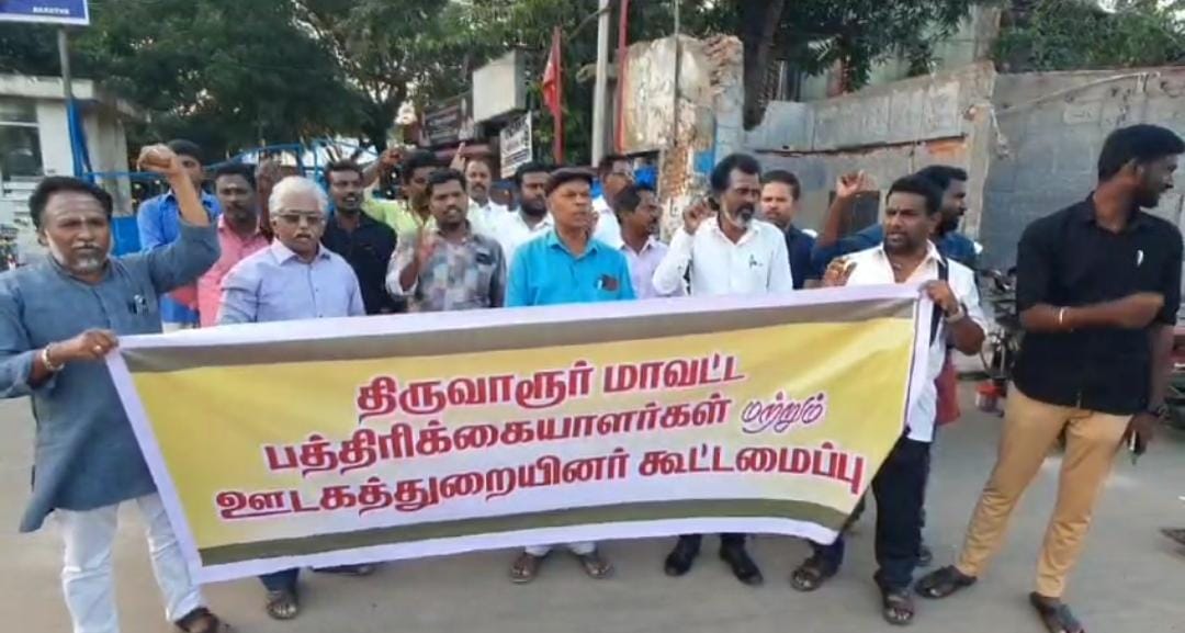 திருவாரூர் பழைய பேருந்து நிலையத்தில் திருவாரூர் மாவட்ட பத்திரிகையாளர் மற்றும் ஊடகத்துறையினர் கூட்டமைப்பு சார்பில் திருப்பூர் மாவட்டம் பல்லடம் தனியார் தொலைக்காட்சி செய்தியாளர் மீது நடத்தப்பட்ட கொலைவெறி தாக்குதல் சம்பவத்தை கண்டித்து மூத்த பத்திரிகையாளர் ஜெயராமன் தலைமையில் ஆர்ப்பாட்டம் நடைபெற்றது இதில் தாக்குதலுக்கு உள்ளான செய்தியாளருக்கு அரசு சார்பில் உயர்ந்த சிகிச்சை அளிக்க வேண்டும், குற்றவாளிகள் அனைவர் மீதும் உரிய நடவடிக்கை எடுக்க வேண்டும் உள்ளிட்ட பல்வேறு கோரிக்கைகளை வலியுறுத்தி ஆர்ப்பாட்டத்தில் ஈடுபட்டனர்