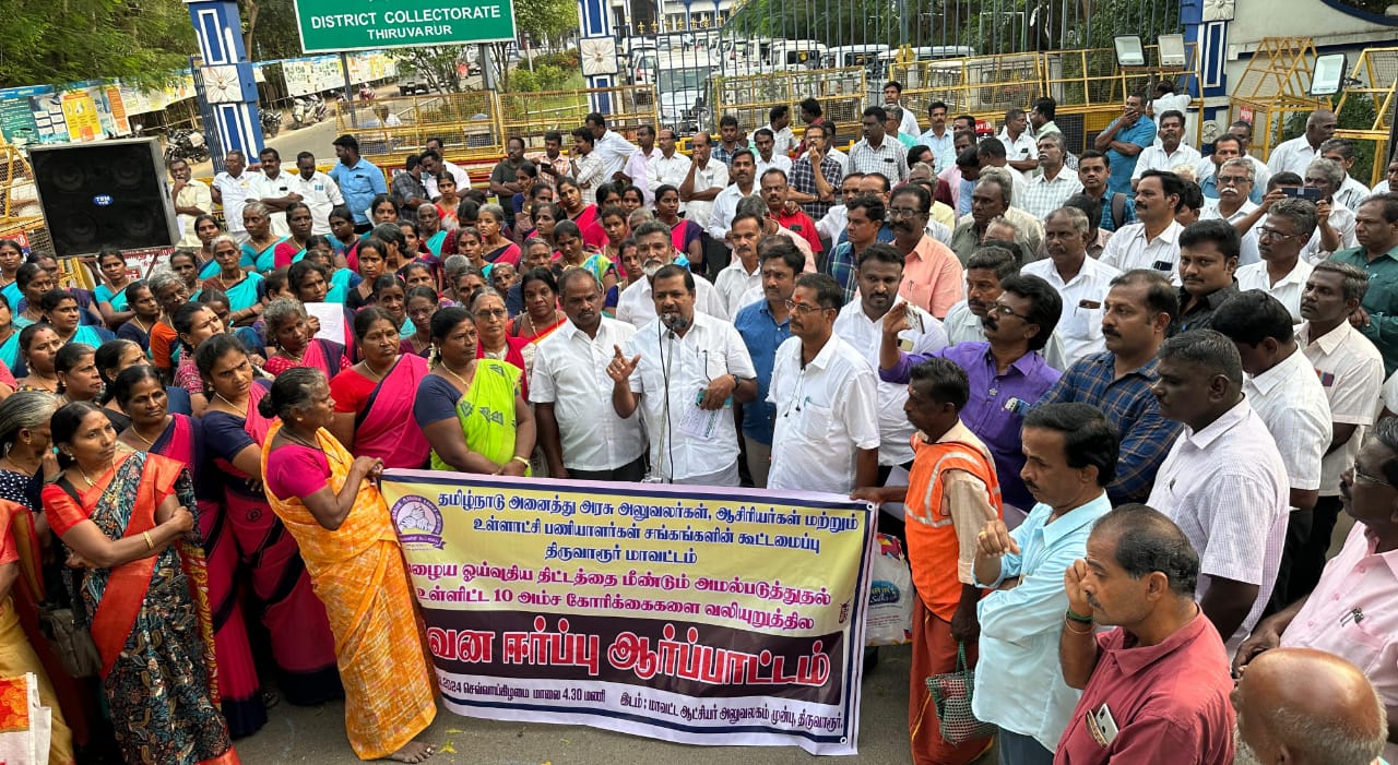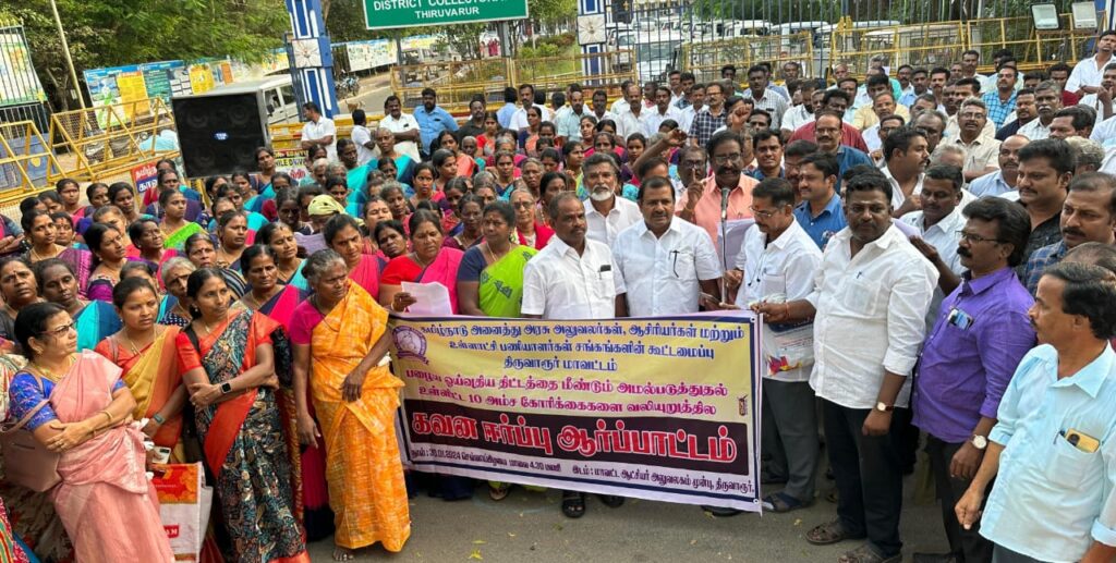 திருவாரூரில் தமிழ்நாடு அனைத்து அரசு அலுவலர்கள், ஆசிரியர்கள் மற்றும் உள்ளாட்சி பணியாளர்கள் சங்கங்களின் கூட்டமைப்பு சார்பில் 10 அம்ச கோரிக்கைகளை வலியுறுத்தி கவனயீர்ப்பு ஆர்ப்பாட்டம் நடைபெற்றது. பழைய ஓய்வூதிய திட்டத்தை மீண்டும் அமல்படுத்த வேண்டும். ஈட்டிய விடுப்பு ஒப்படைப்பு அனுமதி மற்றும் 21 மாத அகவிலைப்படி நிலுவைத் தொகை வழங்க வேண்டும்.