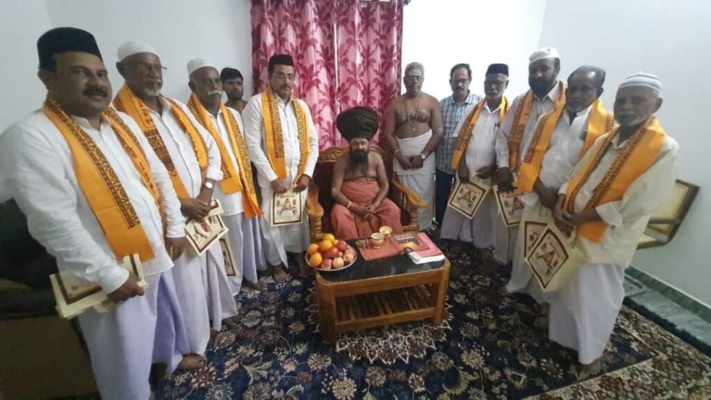 திருபுவனம் கம்பகரேஸ்வரர் கோயில் மகா கும்பாபிஷேக பெருவிழாவில் இஸ்லாமியர்கள் தாம்புல தட்டுடன் தருமபுரம் ஆதீனம் மத நல்லிணக்க சந்திப்பு.