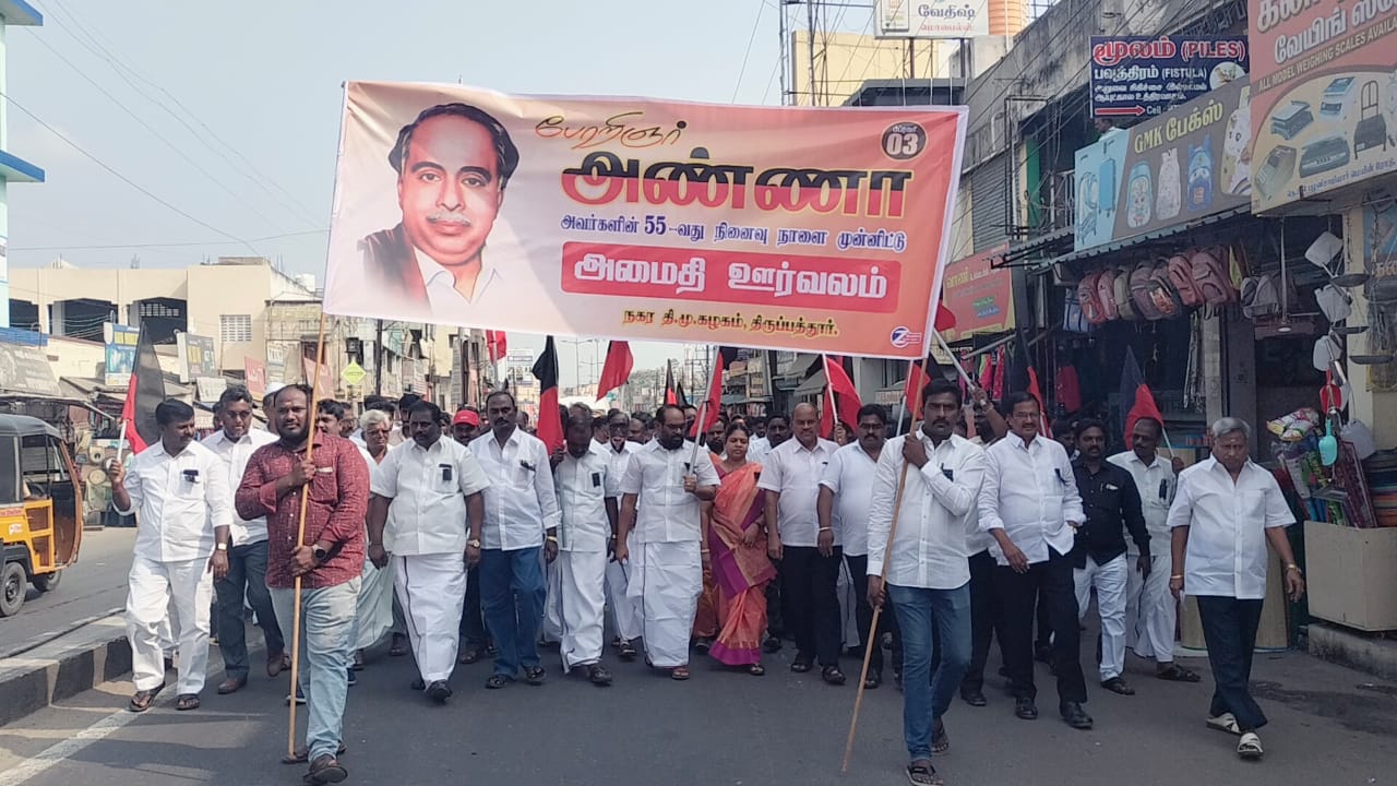 அந்த வகையில் திருப்பத்தூர் மாவட்டம் திருப்பத்தூர் நகராட்சி பழயை பேருந்து நிலையம் பகுதியில் இருந்து சின்னகுளம் மாரியம்மன் கோவில் பகுதி வரை அமைதி ஊர்வலம் திருப்பத்தூர் நகர திமுக சார்பில் நகர செயலாளரும் மாவட்ட ஆவின் தலைவர் எஸ் ராஜேந்திரன் தலைமையில் நடைபெற்றது. அமைதி ஊர்வலம் முடிவில் முன்னாள் முதல்வர் அண்ணாதுரையின் திருவுருவ சிலைக்கு மாலை அணிவித்து நினைவஞ்சலி செலுத்தப்பட்டது.