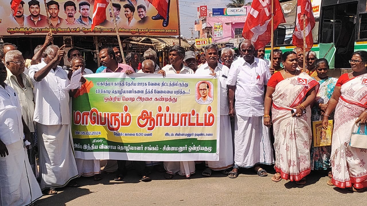 தேனி மாவட்டம் சின்னமனூர் ரவுண்டானா பகுதியில் அகில இந்திய விவசாய தொழிலாளர் சங்கத்தின் சார்பாக எட்டு அம்ச கோரிக்கைகளை வலியுறுத்தி 2014 ஆம் ஆண்டு ஆட்சிக்கு வந்த பாஜக அரசு மகாத்மா காந்தியின் பெயரளான இந்த திட்டத்தை பொறுப்பெற்ற முறையில் செய்தவுடன் தொடர்ந்து திட்டத்தை சிறப்பித்துக் கொலை செய்திடுவோம் முயற்சியாக மேற்கொண்டுள்ளது ஒவ்வொரு ஆடும் வெட்டி சுருக்கி விட்டது 4 லட்சம் கோடி இதை ஒதுக்கீடு செய்து60முதல்70 ஆயிரம் கோடி என 6-ல் ஒரு பங்கு தொகையை மட்டுமே ஒன்றிய அரசு வழங்கியது.