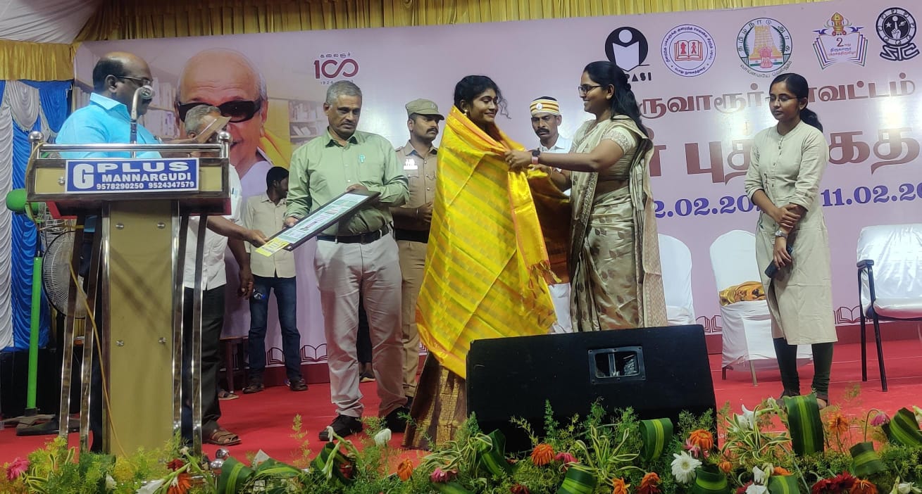இவ்விருதினை திருவாரூர் மாவட்ட ஆட்சியர் அவர்கள் திருவாரூரில் நடைபெற்று வரும் புத்தக கண்காட்சி அரங்கத்தில் உள்ள விழா மேடையில் ஞாயிறு இரவு பொன்னாடை அணிவித்து செல்வி.யாழினிக்கு கலை வளர்மணி விருதினை வழங்கினார்.