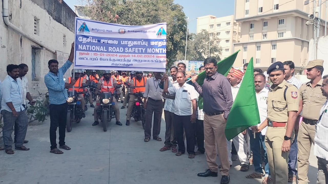 திருப்பத்தூர் மாவட்டம் திருப்பத்தூர் மாவட்ட ஆட்சியர் அலுவலகத்தில் வெள்ளிக்கிழமை இன்று காலை 10 மணி அளவில் திருப்பத்தூர் வட்டார போக்குவரத்து துறை சார்பில் தேசிய சாலை பாதுகாப்பு மாதம் குறித்து விழிப்புணர்வு பேரணியை மாவட்ட ஆட்சியர் தர்ப்பகராஜ் மற்றும் திருப்பத்தூர் எஸ்பி ஆல்பர்ட் ஜான் ஆகியோர் கொடி அசைத்து துவக்கி வைத்தனர். இதில் தலைக்கவசம் அணிவது, சாலை விதிகளை முறையாக கடைபிடிக்க வேண்டும் உள்ளிட்ட விழிப்புணர்வுகள் ஏற்படுத்தப்பட்டது. இந்த விழிப்புணர்வு பேரணி மாவட்ட ஆட்சியர் அலுவலகத்தில் துவக்கி திருப்பத்தூர் நகரின் முக்கிய வீதிகள் வழியாக சென்று மீண்டும் மாவட்ட ஆட்சியர் அலுவலகத்தில் நிறைவு பெற்றது. இதில் மாவட்ட வருவாய் அலுவலர் வளர்மதி, வட்டார போக்குவரத்து அலுவலர் காளியப்பன், வட்டார போக்குவரத்து ஆய்வாளர் விஜயகுமார் மற்றும் கல்லூரி மாணவர்கள், காவலர்கள் உட்பட பலர் கலந்து கொண்டனர்..
