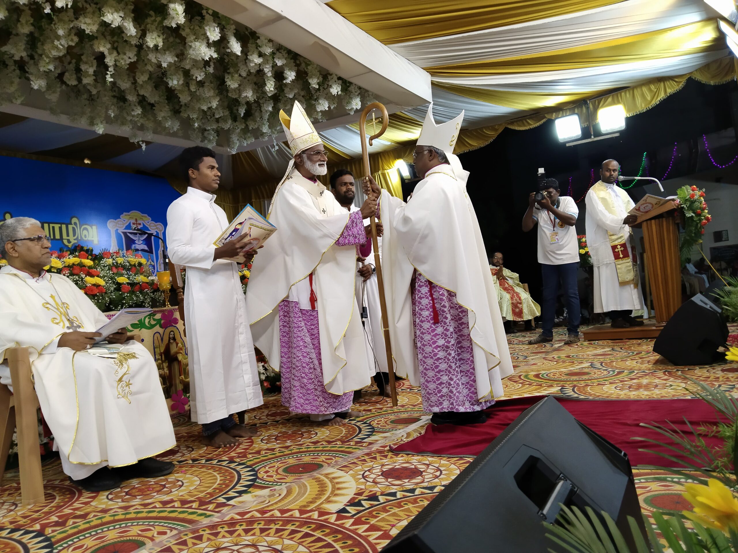 முன்னதாக, ஆயா் இல்லத்திலிருந்து பங்கு தந்தையா்கள், அருட்தந்தையா்கள், உதவி அருட்தந்தையா்கள், தேவாலய அதிபா்கள் ஆகியோா் புதிய ஆயா் ஜீவானந்தம் அமலநாதன் அடிகளாரை இசை நிகழ்ச்சியுடன் பவனியாக விழா மேடைக்கு அழைத்து வந்தனா்.