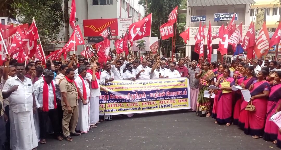 தஞ்சாவூர் மாவட்டம் கும்பகோணம் தலைமை தபால் நிலையம் முன்பு விவசாயிகள், தொழிலாளர்கள் மற்றும் விவசாய தொழிலாளர்கள் விரோத மத்திய அரசை கண்டித்து, தமிழ்நாடு விவசாயிகள் சங்கம் மற்றும் விவசாய தொழிலாளர்கள் சங்கம் சார்பில், விவசாயிகள் சங்கத்தினர் அங்கன்வாடி ஊழியர்கள் என ஏராளமானோர் தலைமை தபால் நிலையத்தை முற்றுகையிட்டு மத்திய அரசுக்கு எதிராக கோரிக்கைகளை வலியுறுத்தி, கோஷங்கள் எழுப்பியவாறு முற்றுகை போராட்டத்தில் ஈடுபட்டனர்.