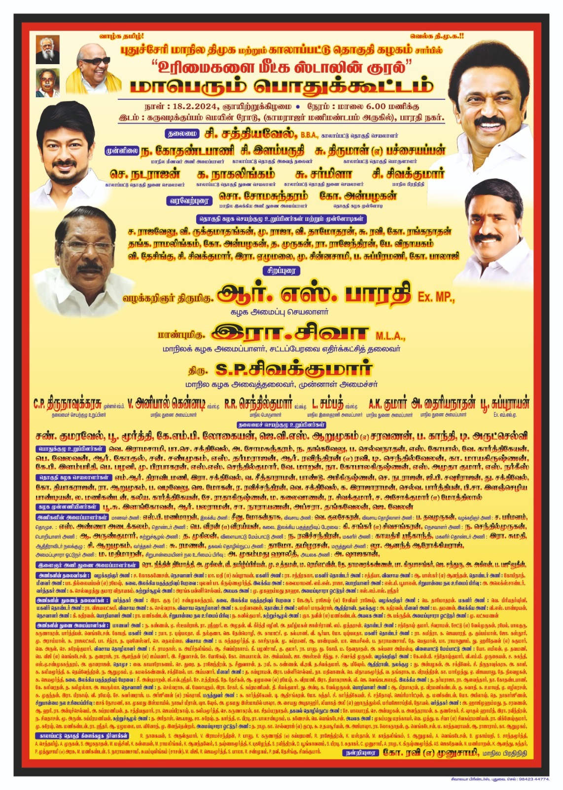 வணக்கம். நாடாளுமன்றத் தேர்தல் 2024–இல் கடந்த பத்தாண்டு காலத்தில் ஒன்றிய பா.ஜ.க. அரசு, தமிழ்நாடு மற்றும் புதுச்சேரி மாநிலங்களுக்கு இழைத்த அநீதிகளையும், ஒன்றிய அரசிடம் மாநில உரிமைகளை அடகு வைத்து தற்பொழுது நாடகமாடும் என்.ஆர். காங்கிரசின் துரோகங்களை மக்களிடம் கொண்டு சேர்க்கும் வகையில், முதற்கட்டமாக, கழக முன்னணியினர் “உரிமைகளை மீட்க ஸ்டாலின் குரல்” என்ற தலைப்பில் நாடாளுமன்றத் தொகுதி வாரியான கூட்டங்களில் பங்கேற்று சிறப்புரையாற்ற உள்ளனர்.