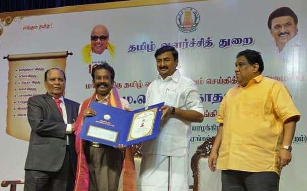 சென்னை முத்தமிழ்ப்பேரவை அரங்கில் மதுரை மாவட்டத்தின் 2022 ஆண்டிற்கான தமிழ்ச்செம்மல் விருதை கவிஞர் இரா.இரவிக்கு, தமிழ்வளர்ச்சித்துறை மற்றும் செய்தி ஒலிபரப்புத்துறை அமைச்சர் சாமிநாதன் வழங்கினார். உடன் இயக்குனர் ஔவை.அருள்,V.g.சந்தோசம் உள்ளனர்.