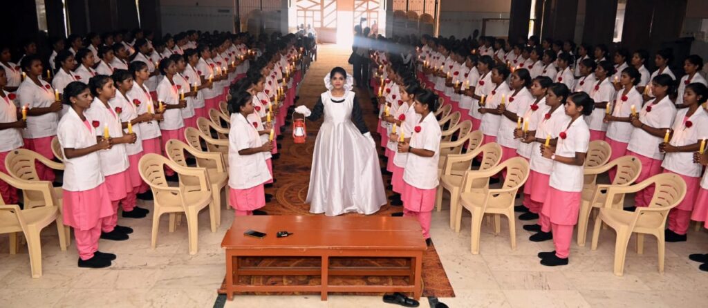 கல்லூரியின் துணை முதல்வர் கிருத்திகா, செவிலிய பணிக்கான உறுதிமொழியைக் கூறி செவிலிய மாணவிகளை வழிநடத்தினார்.