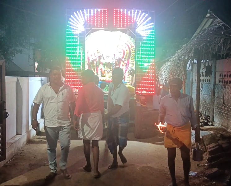 தொடர்ந்து காமாட்சியம்மன் வண்ண மலர்களால் சிறப்பு அலங்காரம் செய்யப்பட்டு அம்மன் வீதி உலா நிகழ்ச்சி நடைபெற்றது அப்போது இல்லம் தோறும் அம்மனுக்கு தேங்காய் உடைத்து சூடம் ஏற்றி அம்மனை வழிபட்டனர்.