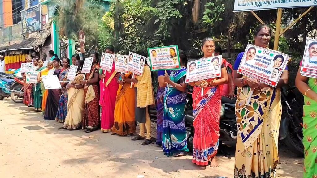 மயிலாடுதுறை மாவட்டம் சீர்காழி புதிய பேருந்து நிலையம் எதிரே அதிமுக சார்பில் தமிழகத்தில் போதை பொருள் புழகத்தை கட்டுப்படுத்த தவறிய திமுக அரசை கண்டித்து அதிமுகவினர்கள் மனித சங்கிலி போராட்டம்.முன்னாள் சட்ட மன்ற உறுப்பினர் சக்தி தலைமையில் நடைபெற்றது.இதில் 200க்கும் மேற்பட்ட அதிமுகவினர் சுமார் ஒரு கிலோமீட்டர் தூரம் வரை மனித சங்கிலி போராட்டத்தில் ஈடுபட்டனர்.முன்னதாக புதிய பேருந்து நிலையம் எதிரே திமுக ஆட்சியில் தமிழகம் போதை பொருள் தலைநகரமாக மாறிப்போச்சு,போதை பொருள் கடத்தல் காரர்களுக்கு துணை போகும் தமிழக அரசை விரட்டுவோம் போன்ற பதாகைகளை ஏந்தி தமிழக அரசுக்கு எதிராக கண்டன கோஷங்களை எழுப்பினர். இந்தப் போராட்டத்தில் சீர்காழி கிழக்கு ஒன்றிய கழக செயலாளர் ஏ கே சந்திரசேகரன் கொள்ளிடம் ஒன்றிய கழக செயலாளர் நற்குணன் சிவக்குமார் சீர்காழி நகர செயலாளர் எல் வி ஆர் வினோத் சீர்காழி நகர்மன்ற உறுப்பினர்கள் உள்ளிட்ட அதிமுகவினர் கலந்து கொண்டனர்
