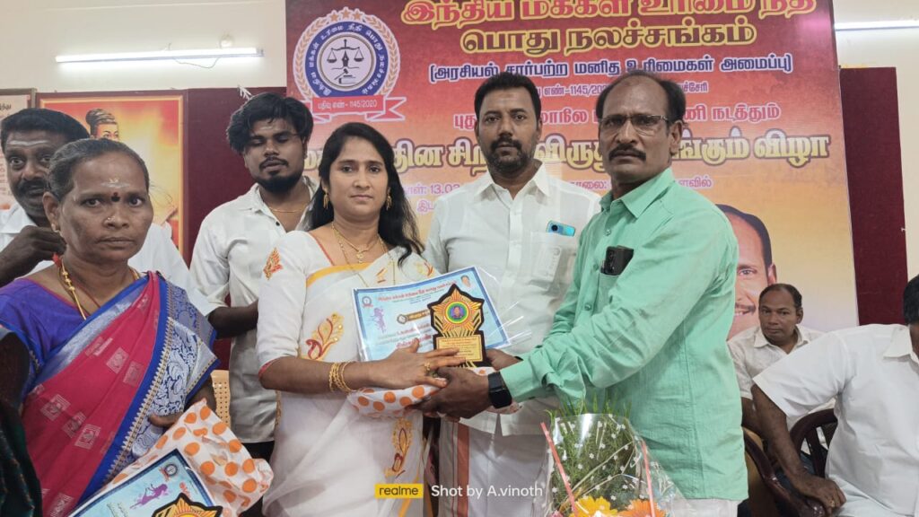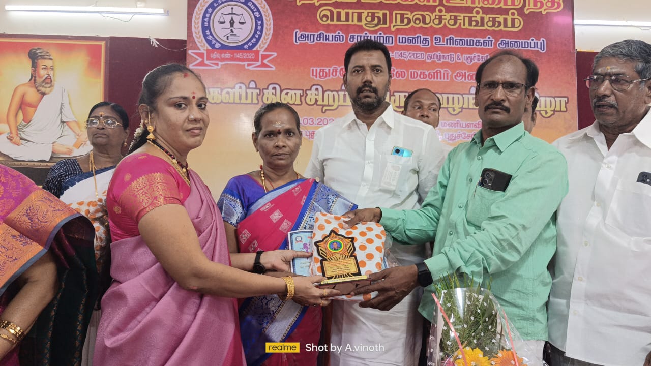 புதுவை வெங்கடா நகரில் உள்ள தமிழ் சங்கத்தில் இந்திய மக்கள் உரிமை நீதி பொதுநல சங்கம் சார்பில் மகளிர் தின விழா நடந்தது. தேசிய மகளிர் தலைவர் நாகலட்சுமி தலைமை தாங்கினார்.