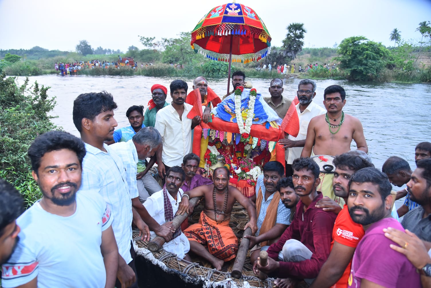 சத்தியமங்கலம் பண்ணாரி மாரியம்மன் சப்பரம் பரிசலில் பவானி ஆற்றை கடந்த சென்றது