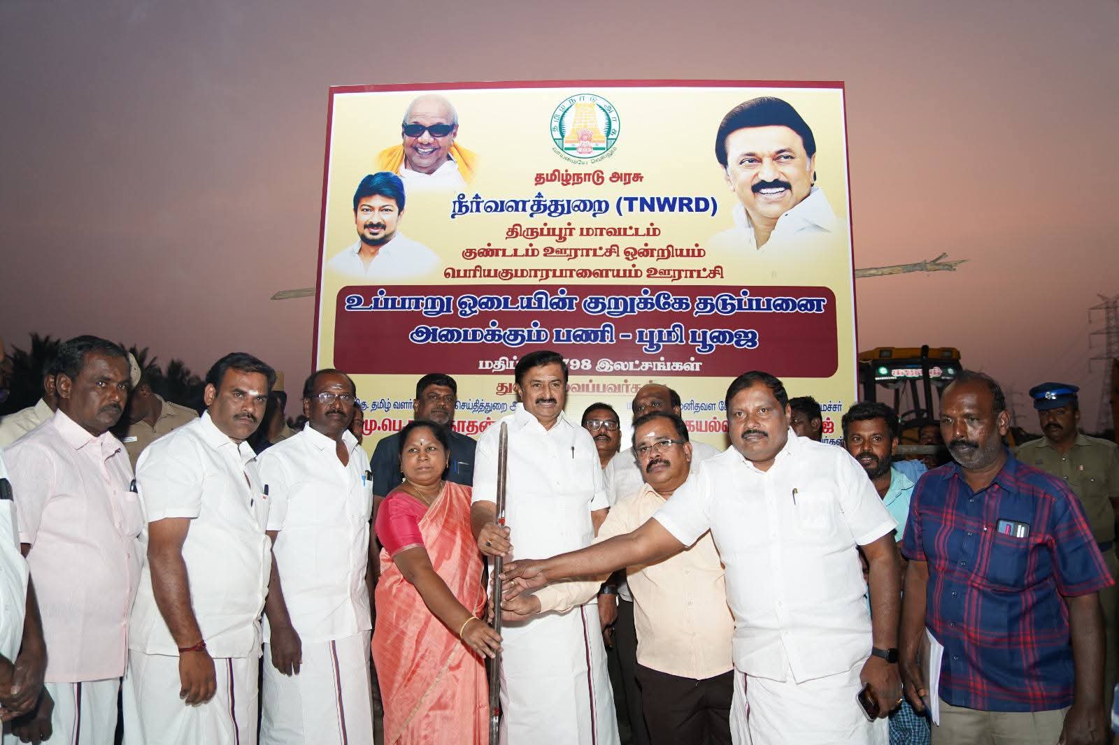 திருப்பூர் மாவட்டம், தாராபுரம் அருகே பெரிய குமாரபாளையம் பகுதியில் நீர்வளத்துறை சார்பில் ரூ.7.98 கோடி மதிப்பீட்டில் உப்பாறு ஓடையின் குறுக்கே தடுப்பணை அமைக்கும் பணிகளை செய்தித்துறை அமைச்சர் மு.பெ.சாமிநாதன், மனிதவள மேலாண்மைத்துறை அமைச்சர் கயல்விழி ஆகியோர் திங்கட்கிழமை இரவு துவக்கி வைத்தனர்.