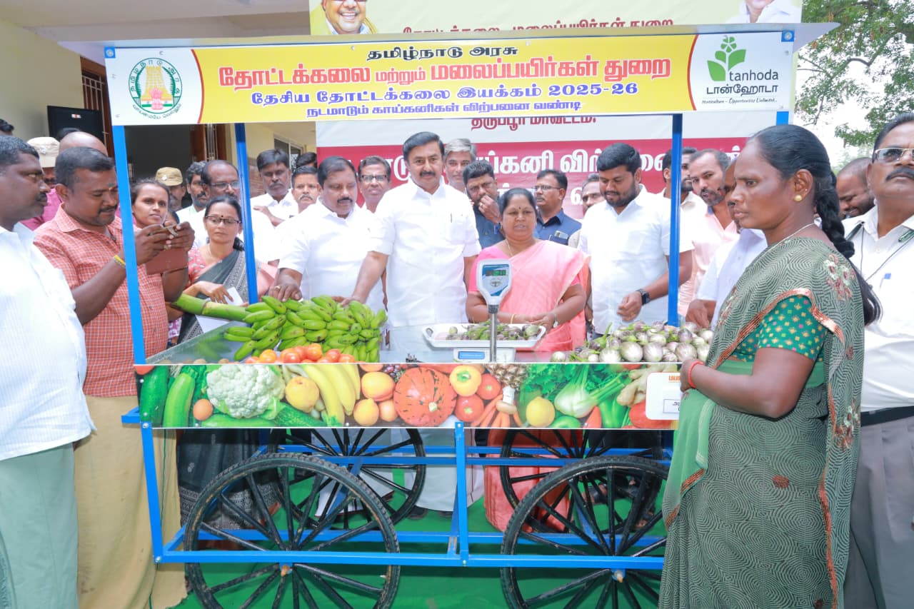 இந்த நிகழ்ச்சியில், தமிழ்நாடு அரசு அமைச்சர்கள் மு.பெ.சாமிநாதன் மற்றும் கயல்விழி ஆகியோர் சிறப்பு விருந்தினர்களாக கலந்து கொண்டு, நடமாடும் காய்கறிகள் விற்பனை வண்டிகளை பயனாளிகளுக்கு வழங்கி தொடங்கி வைத்தனர்.