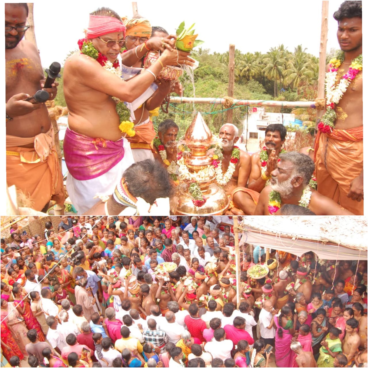 இதனைத் தொடர்ந்து இரண்டாம் நாள் காலை மங்கல இசை முழங்க மகா பூர்ணாஹூதி, தீபாராதனை நடைபெற்றது. ராமேஸ்வரம், அழகர்கோவில், காசி, கங்கை, உள்ளிட்ட திருத்தலங்களில் இருந்து கொண்டு வரப்பட்ட புனித நீர் மேளதாளங்கள் முழங்க யாகசாலையை சுற்றி வலம் வந்து கோபுர உச்சிக்கு கொண்டு செல்லப்பட்டு வேத மந்திரங்கள் முழங்க கருடன் வானத்தில் வட்டமிட கலசத்தில் புனித நீர் ஊற்றப்பட்டு கும்பாபிஷேகம் நடைபெற்றது.