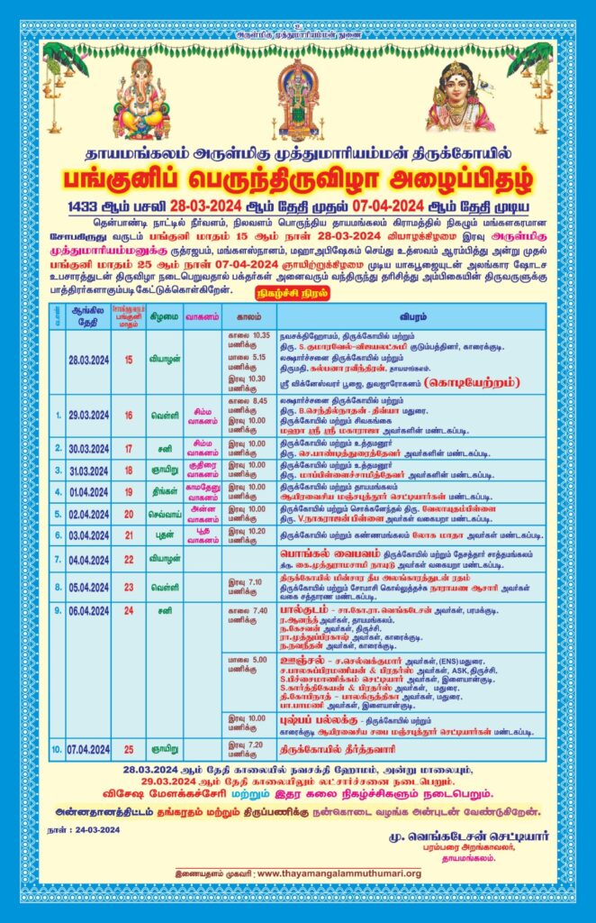 முக்கிய நிகழ்ச்சியான பங்குனி பொங்கல் விழா வருகிற ஏப்.4ம் தேதி நடைபெற உள்ளது. மறுநாள் 5ம் தேதி இரவு 7:10 மணிக்கு மின் அலங்கார தேரோட்டம் நடைபெற உள்ளது.6ம் தேதி காலை 7:40 மணிக்கு பால்குடம் நிகழ்ச்சியும், மாலை 5:00 மணிக்கு ஊஞ்சல் உற்ஸவம் நிகழ்ச்சியும் இரவு 10:00 மணிக்கு புஷ்ப பல்லக்கும் நடைபெற உள்ளது.7ம் தேதி கோயில் தீர்த்தவாரி நிகழ்ச்சியுடன் திருவிழா நிறைவு பெறுகிறது. ஏற்பாடுகளை பரம்பரை அறங்காவலர் வெங்கடேசன் மற்றும் கோயில் பணியாளர்கள் செய்து வருகின்றனர்.