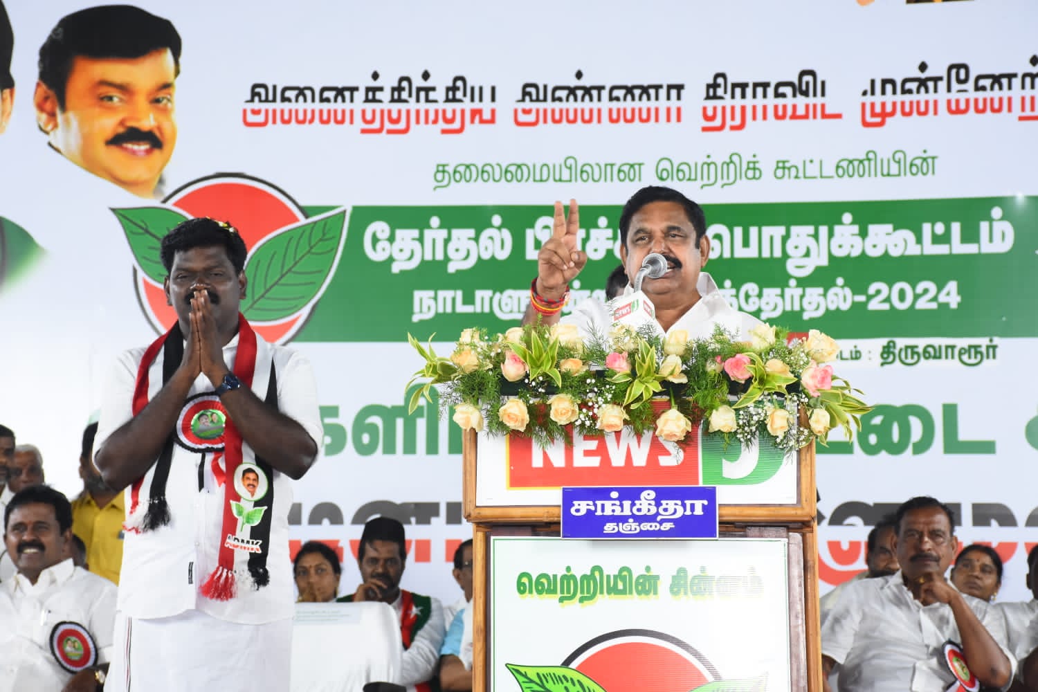 மூன்றாண்டு காலம் செங்கல் தூக்கியே திரியும் அமைச்சர் உதயநிதி. 38 எம்பிக்களும் அதே செங்கல்லை நாடாளுமன்றத்தில் காட்டி இருந்தால் எய்ம்ஸ் வந்திருக்கும் என திருவாரூரில் நடைபெற்ற பிரச்சார பொதுக்கூட்டத்தில் அண்ணா திமுக பொதுச் செயலாளர் எடப்பாடி பழனிச்சாமி பேச்சு..